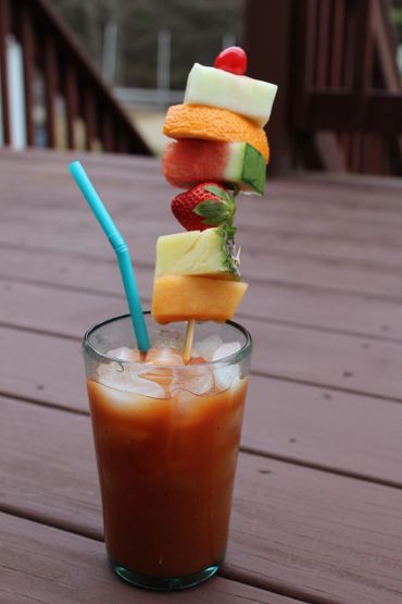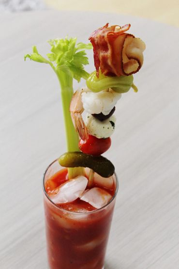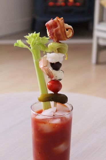 Fill a 16 oz glass with Ice, add the Bloody Mary mix with the vodka, stir and serve. Add the garnish, eat, drink, and be Mary.