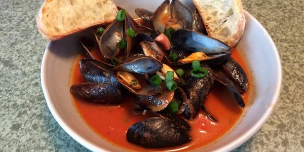 In a large covered sauté pan add the Bloody Mary mix, sour cream, Old Bay seasoning, and whisk together. Place the mussels in a colander in the sink and run water over them, using your hands or a clean scrubbing brush to rub off any debris. If you need to remove the beard from the mussels, grab it with your thumb and forefinger and tug it toward the hinge of the mussel shell. Add to the sauté pan. Dice the scallions, kielbasa or chorizo, and add to the top of the mussels. Cover, bring to a boil and simmer for 5 minutes, then spoon the mix over the mussels for one last bath before they satisfy your appetite. Toast some ciabatta bread and serve alongside for some quick dipping. Enjoy and be sure to share this recipe.